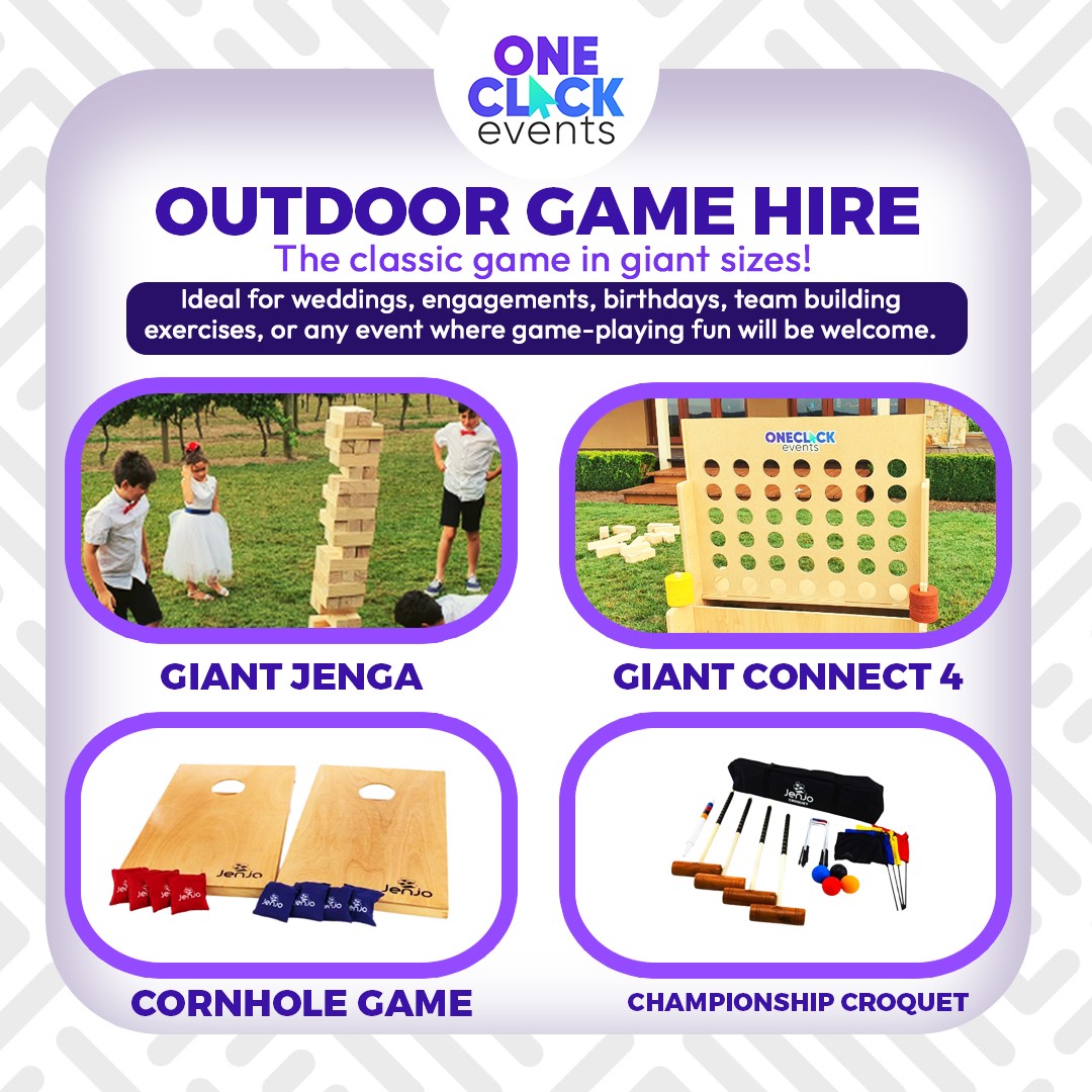 - Outdoor Games : Giant Jenga , Giant Connect 4, Cornhole Game & Championship Croquet