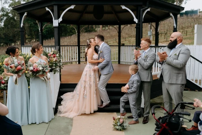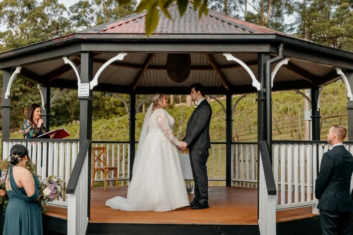 We offer several beautiful ceremony location options. Couples can exchange vows beneath our elegant gazebo on the terrace, overlooking the vineyard for a truly picturesque setting or on a lush, grassy area nestled between two majestic gum trees — a perfect open-air ceremony.