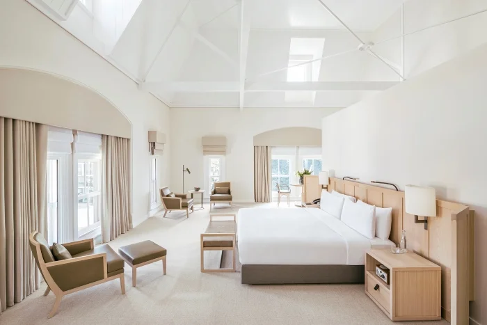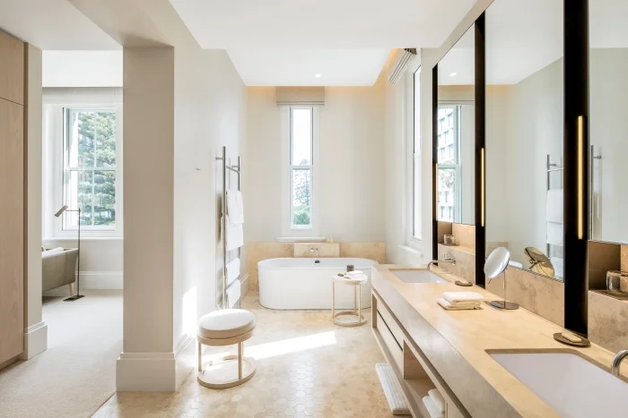 Within each of the luxury hotel’s 48 rooms and suites, minimooners are immediately soothed with a symphony of biscuit, buttermilk and limewashed hues, which simultaneously underscore the ornate architecture of the buildings’ original interiors. Each room is unique and, depending on position, the likes of vaulted-ceilings, French doors, sash windows, fireplaces and balcony access feature, though spacious layouts, king-size beds, Egyptian cotton sheets, in-room yoga mats, up-to-the-minute tech and bathrooms with freestanding tubs and heated travertine floors are ‘standard’.