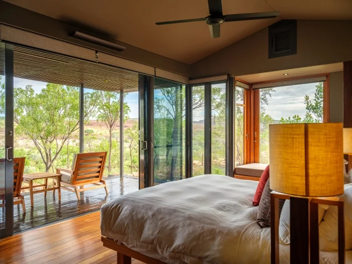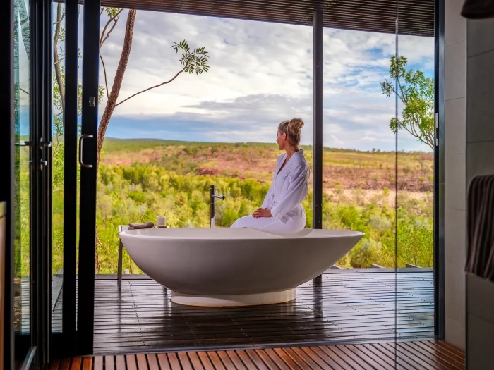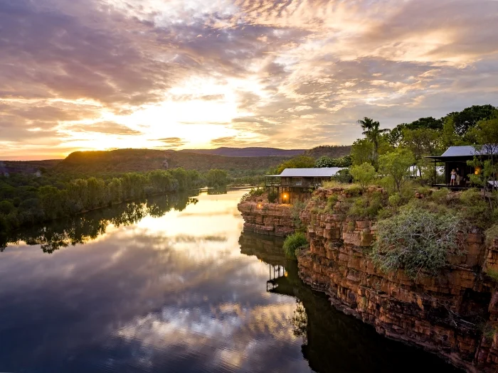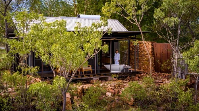 Welcoming only 20 adult guests, the 10 suites here vary but all indulge creature-comforts with inviting naturally-inspired interiors, and many feature decadent baths and beds cantilevered over the spectacular Chamberlain Gorge and River — perfectly positioned for savouring the sweeping panoramic vistas, and spotting the occasional crocodile on the riverbank beneath.