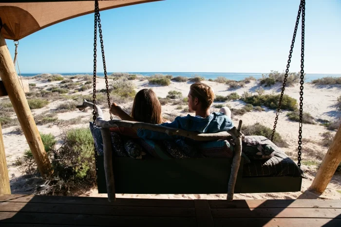The UNESCO World Heritage-listed Ningaloo Reef, footsteps from the tents and submerged just beneath the gently lapping waves, is the real lure for adventure-seeking couples though. Home to turtles, dugongs and hundreds of species of coral and colourful fish, at certain times of the year it is also the playground of whale sharks and humpbacks, and swims and close-up encounters with these magnificent creatures are, perhaps, the highlight of the many memory-making moments available.